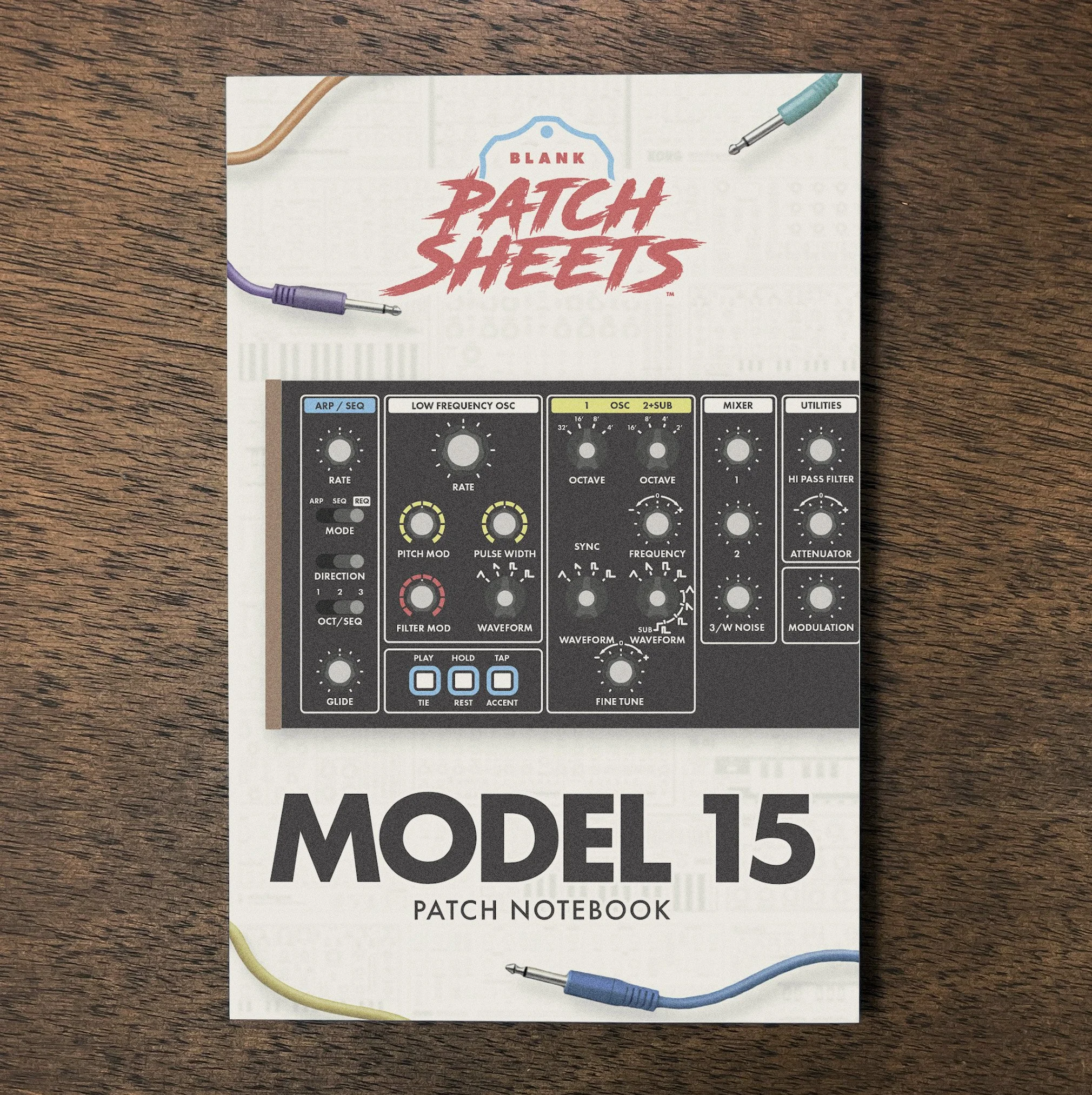 A dedicated patch notebook built for the Behringer Model 15. Log every knob position and patch cable, then recall any sound instantly.